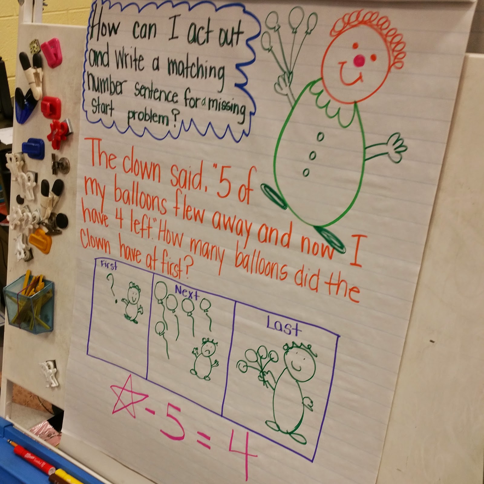 This is the anchor chart I had. I had not filled out the storyboard yet obviously. So after telling the story, I told the kids that today we were going to work with story boards to help us solve our word problems. I told them that writers, readers, scientists, and mathematicians all use story boards to organize and solve problems. I then had them turn to their partner, and retell the story of the sad little snowman. Then I had them share what happened first, next, last. With each student that shared, I was looking for something specific like, "The clown started with some but we don't know how many" or "I know 5 flew away". While they were telling me each step I drew the picture on the storyboard to match. Then we made the number sentence. I then sent them back to their desk with a storyboard with a similar start unknown clown word problem. We did it together. I had some students show their work on the document camera. I then gave them differentiated word problems, while i pulled 5 students that needed a little extra assistance. I then pulled the kids back together to review our I can statement and briefly talk about it as my closure.