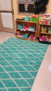 This bulletin board is just our class names. Below it is part of our classroom library. I decided to make 2 separate libraries for more room. It seems that 1st graders like to spread out when reading, so I thought having 2 separate carpets would help :)
